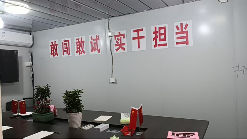 (图注:羊场会议室悬挂“敢闯敢试 实干担当”标语,彰显创业初心与担当)